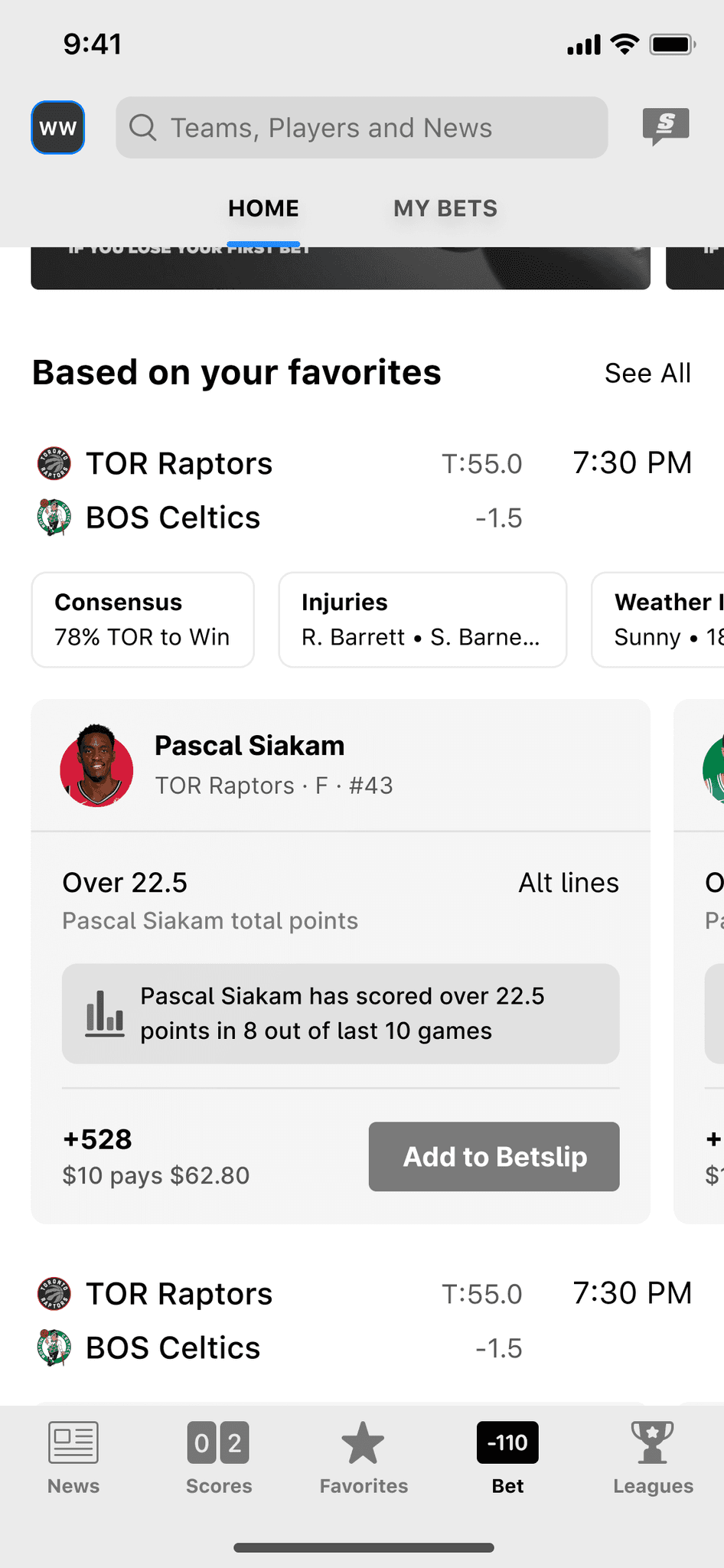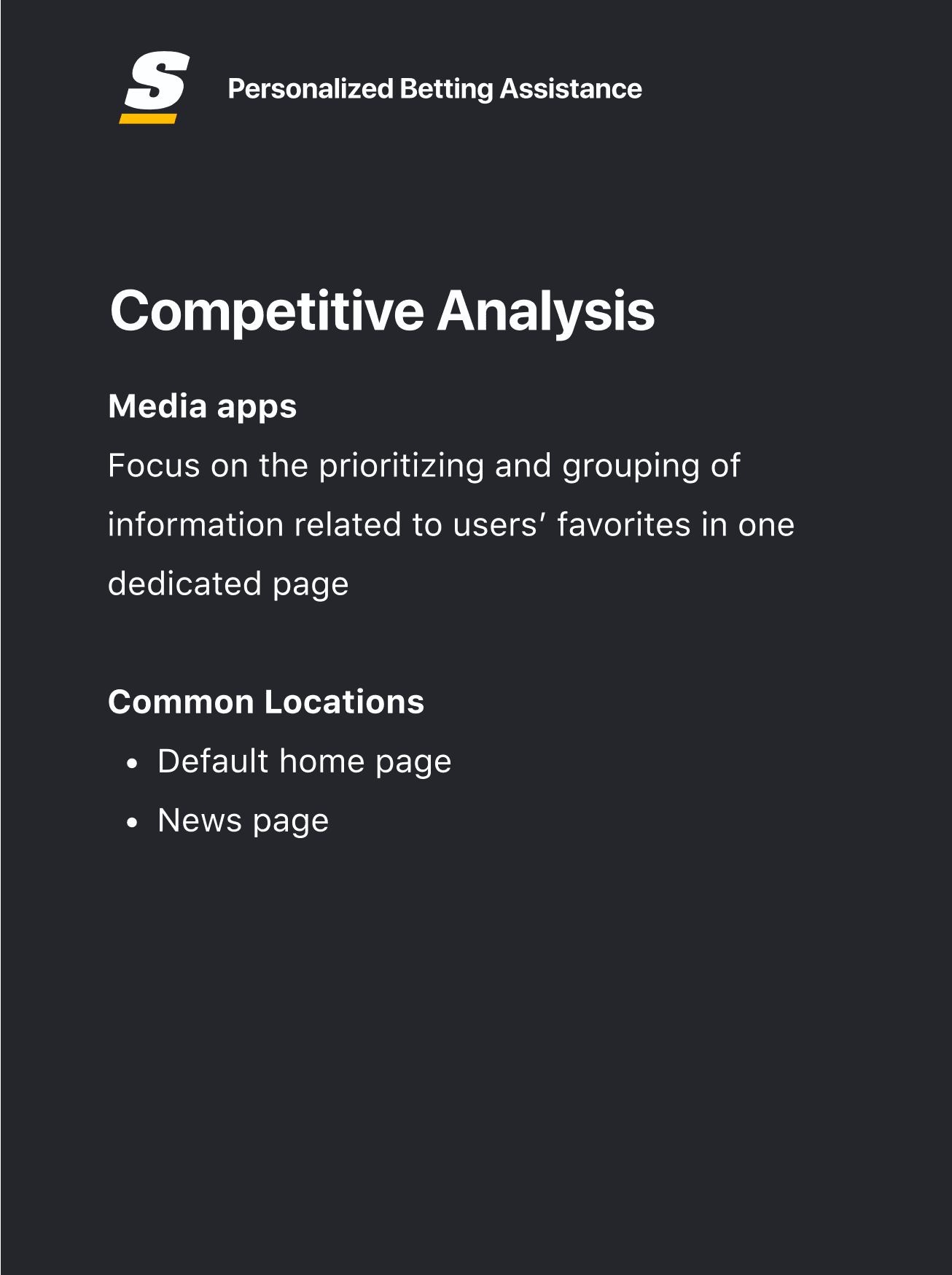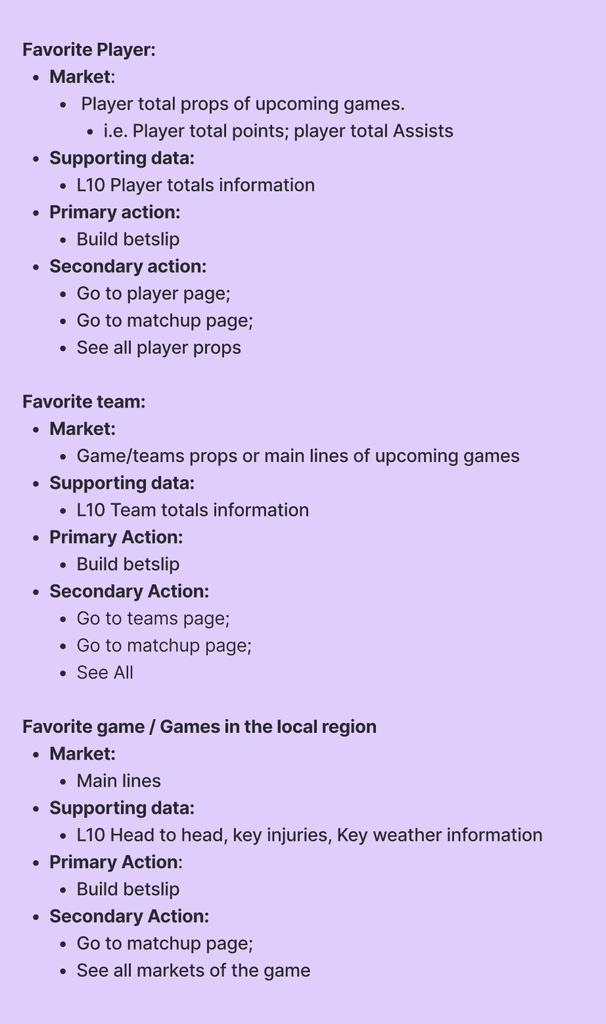 As a team that lives between the sports app and bet app, our vision is showcase the offerings of our bet app and help betting-curious users have a easy discovery and transition into sports betting. Therefore, we introduced betting market touch points across the sports app.