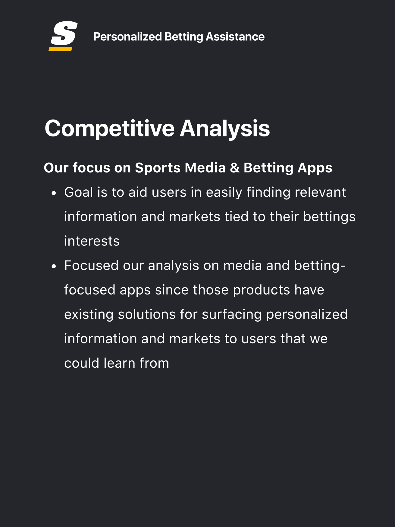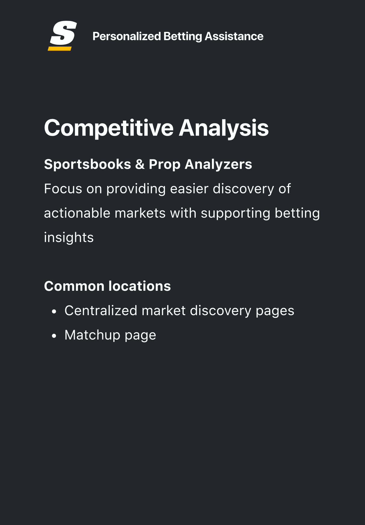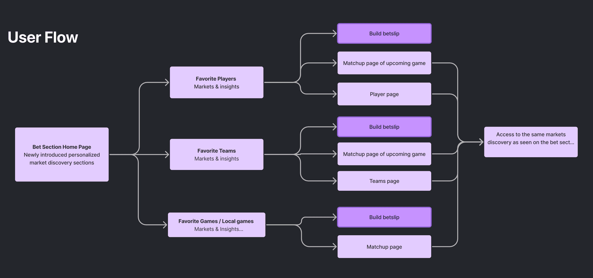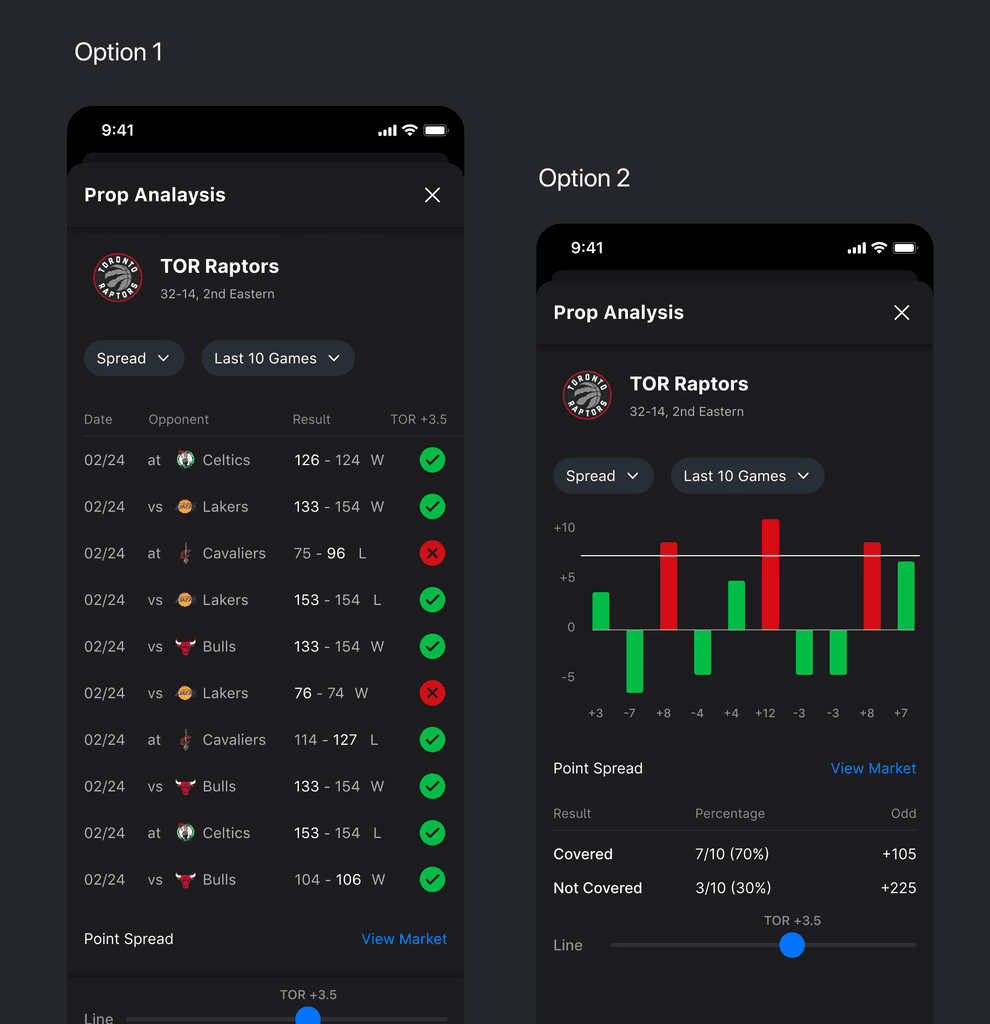 As a team that lives between the sports app and the bet app, our vision is to showcase the offerings of our bet app and help betting-curious users have a easy discovery and transition into sports betting. Therefore, we introduced betting market touch points across the sports app.